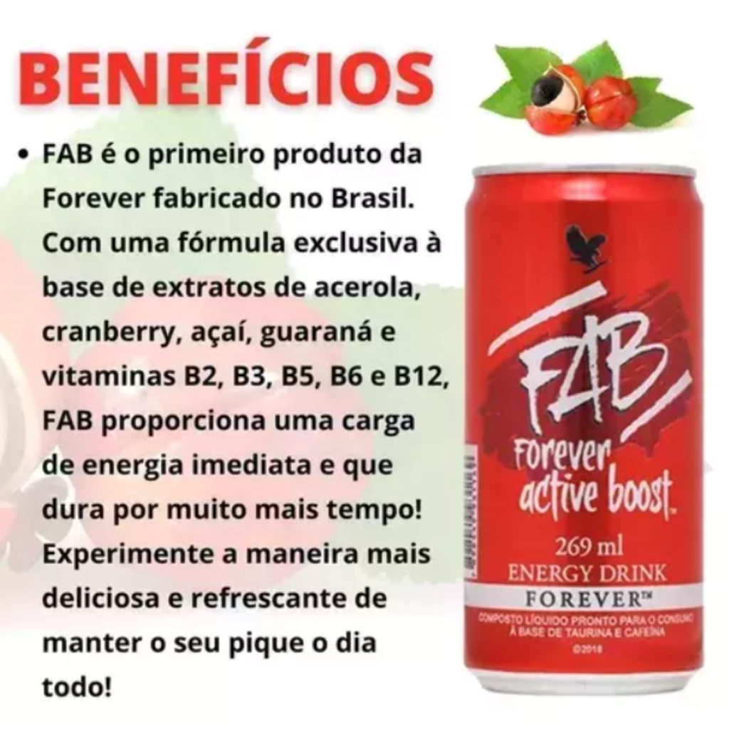 O Forever Active Boost - FAB é o primeiro produto da Forever fabricado no Brasil, projetado especialmente para aqueles que buscam energia e disposição ao longo do dia. Com uma fórmula exclusiva que combina extratos de acerola, cranberry, açaí, guaraná e um complexo de vitaminas B2, B3, B5, B6 e B12, este energético oferece uma carga de energia imediata e duradoura.